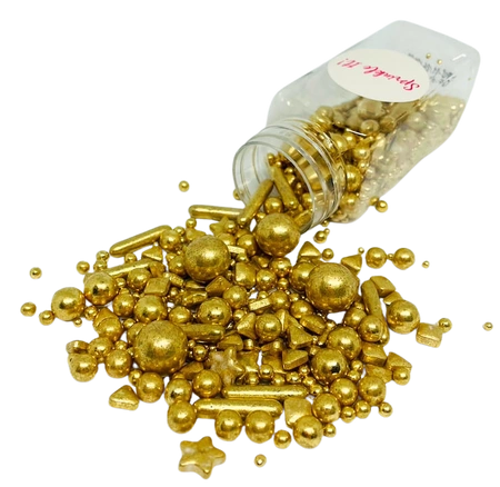 Szukasz dekoracji, która doda Twoim wypiekom wyjątkowego blasku i elegancji? Posypka cukrowa Lovely Gold 100g Sprinkle It! to idealny wybór! Ta wyjątkowa mieszanka złotych perełek o różnej średnicy, gwiazdek, makaroników, kwadracików i trójkącików sprawi, że Twoje torty, muffinki, ciasta i desery będą wyglądały jak małe dzieła sztuki.