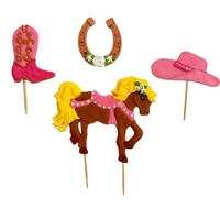 Dekoracje cukrowe na tort ZESTAW JEŹDZIECKI (koń, kapelusz, podkowa, but) różowy