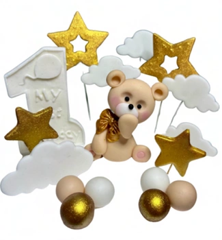 Zestaw biało złoty figurek cukrowych na tort z MISIEM ROCZEK
