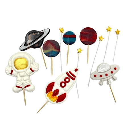Zestaw Figurki na Tort Kosmos - Zestaw Czerwony od firmy Slado to doskonała dekoracja na torty dla wszystkich miłośników kosmosu. Wykonane z jadalnej masy cukrowej figurki w formie topperów na wykałaczkach wprowadzą na wypieki kosmiczny klimat. Zestaw zawiera różnorodne elementy, takie jak kosmonauta, planeta z pierścieniem, statek kosmiczny, rakieta, planety i gwiazdki, które umożliwiają stworzenie kreatywnej dekoracji. Każda figurka jest ręcznie wykonana, co dodaje jej unikalnego charakteru.