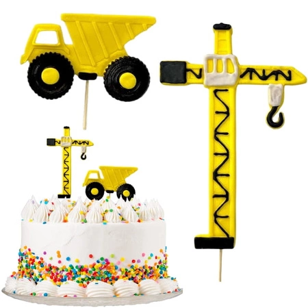 - Motyw budowlany: Zestaw zawiera dźwig i wywrotkę, które idealnie nadają się na torty tematyczne związane z budownictwem i maszynami.