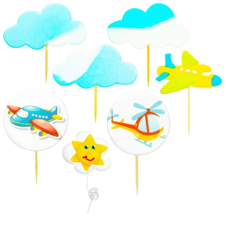 Zestaw Samoloty 2D od firmy Ditarte to wyjątkowa dekoracja tortów, idealna na przyjęcia tematyczne, urodziny, czy inne specjalne okazje. Wykonane z jadalnej masy cukrowej, figurki w formie topperów przedstawiają chmurki, samoloty, helikopter i słoneczko, które wprowadzą radosny, podniebny nastrój na każdy tort. Dzięki ręcznemu wykonaniu każda figurka jest unikalna, co dodaje jej wyjątkowego charakteru.
