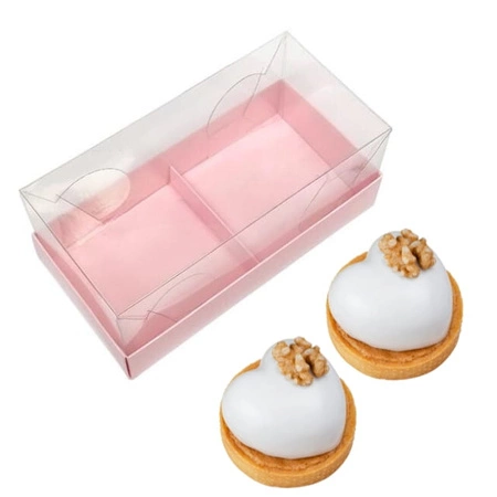 Opakowanie na 2 monoporcje zostało przygotowane w formie, która po złożeniu tworzy stabilną, estetyczną bryłę. Aby karton dobrze się ułożył, poszczególne elementy należy mocno dogiąć w miejscach bigowania. Starannie zagięte ścianki i rogi sprawiają, że pudełko trzyma kształt, a wieczko dobrze przylega, zabezpieczając słodkości przed kurzem, dotykiem i przypadkowym uszkodzeniem. Transparentna pokrywka idealnie współpracuje z różową podstawą, tworząc wizualnie lekką, ale wytrzymałą konstrukcję.