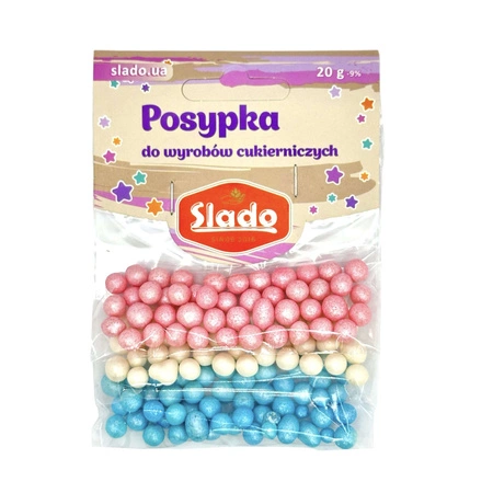 Perełki Perłowe Białe, Niebieskie, Różowe od firmy Slado to elegancka posypka cukrowa w formie ryżowych perełek, oblane glazurą cukrową. W zestawie znajdują się trzy rodzaje perełek o średnicy 7 mm: niebieskie, różowe i białe. Te delikatne i efektowne dekoracje doskonale nadają się do ozdabiania różnorodnych słodkich wypieków, takich jak torty, ciasta i babeczki. Dzięki swoim subtelnym kolorom, perełki są idealnym wyborem na przyjęcia komunijne, wesela, chrzciny oraz inne uroczyste okazje, dodając wypiekom wyjątkowego uroku i elegancji.