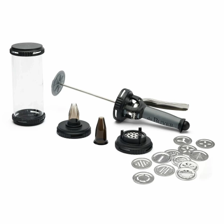 W zestawie z pistoletem Le Tube znajdują się dwie końcówki wykonane z trwałego poliwęglanu: gładka i w kształcie gwiazdy, co daje szerokie możliwości dekoracyjne. Dodatkowo, do pistoletu dołączony jest zestaw 13 dysków do formowania ciastek oraz pokrywa zabezpieczająca końcówkę dozownika, co jeszcze bardziej zwiększa funkcjonalność tego narzędzia.