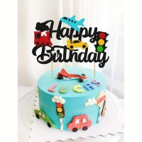 Papierowy topper na tort Happy Birthday PODRÓŻ SAMOLOT AUTO POCIĄG SYGNALIZATOR
