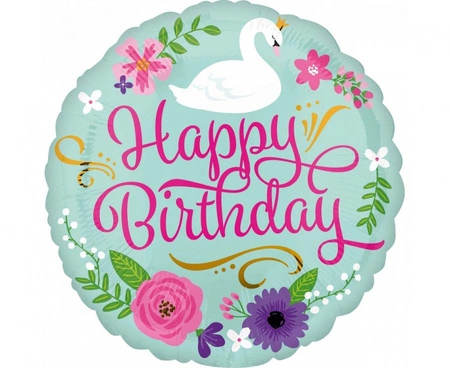 Nadruk: napis "Happy Birthday", Łabędź i kolorowe kwiaty