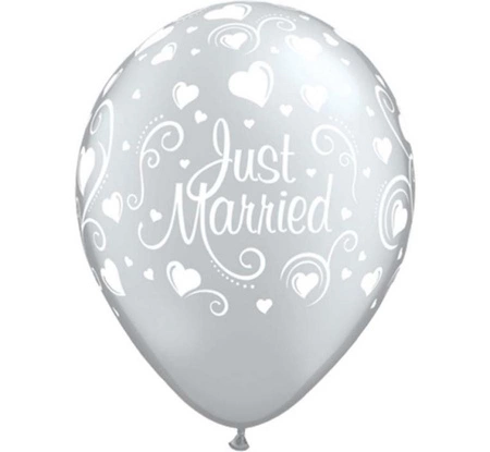 #BL Balon QL 11" z nadr. "Just Married i serduszka", metalik srebrny/ 25 szt. KK