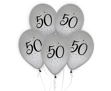 BALONY 50 URODZINY, SREBRNE, 12", 5szt. Rozmiar: 12" (30cm) Ilość: 5 szt. Kolor: srebrny Nadruk: liczba 50