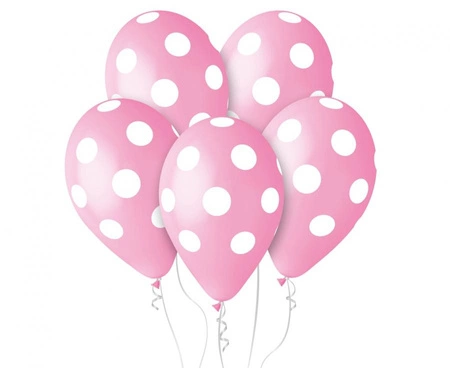 BALONY GROCHY, JASNORÓŻOWE, 12" / 5 SZT. Rozmiar w calach: 12 " Ilość sztuk w opakowaniu: 5 szt. Kolor: jasnoróżowy Wzór: grochy Producent: Gemar