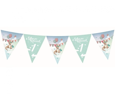 Nadruk: kangurek, chmurki, balony, girlanda, napis: Mam już 1 Roczek