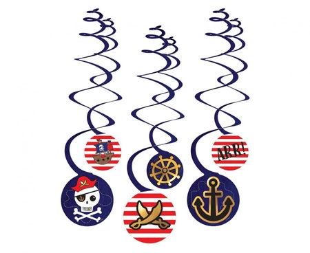 DEKORACJA WISZĄCA Z PIRACKIM MOTYWEM Długość: 13 cm Materiał: papier Kolor: granatowy, czerwony W opakowaniu: 6 szt. Producent: Amscan