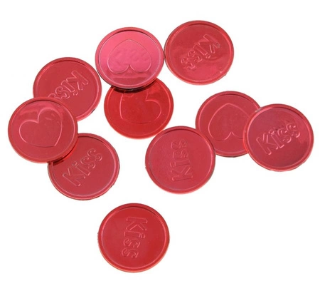 PLASTIKOWE MONETY WALENTYNKOWE Ilość sztuk w opakowaniu: 24 Z jednej strony moneta ma napis KISS a z drugiej serce. Monety są koloru czerwonego.