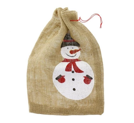 WOREK ŚWIĄTECZNY BAŁWANEK Wymiary: 36 cm x 50 cm Materiał: juta Kolor: naturalny Nadruk: bałwanek Posiada czerwony sznureczek ściągający.