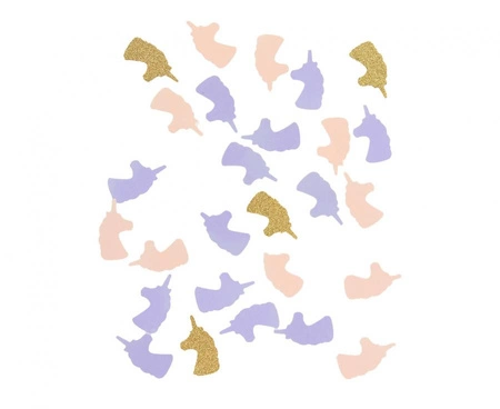 Papierowe konfetti w kształcie jednorożca w kolorach złotym brokatowym, różowym i fioletowym.