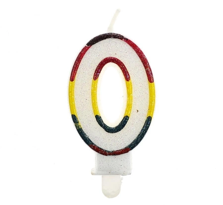 ŚWIECZKA CYFRA 0, KOLOROWY BROKAT Kolor: biały, kolorowy kontur Ilość: 1 szt. Producent: Godan S.A.