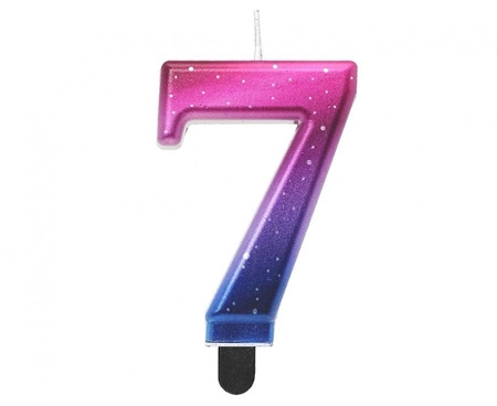 Świeczka Cyferka 7, metaliczna Night Sky, Beauty&Charm Wysokość świeczki: 8 cm Głębokość: 1,2 cm Wysokość plastikowej podstawki: 1,3 cm Rodzaj: cyfra Kolor: ombre (gradient kolorów: różowy, niebieski) Element ozdobny: delikatne białe kropeczki Ilość: 1 szt. Kolekcja: Beauty & Charm Producent: Godan S.A.