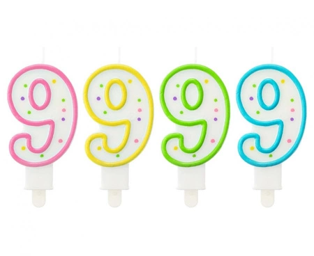 ŚWIECZKA CYFRA 9, URODZINY KROPECZKI Wysokość świeczki: 6,5 cm Wysokość świeczki z podstawką: 7,5 cm Ilość: 1 szt. Producent: Godan S.A.