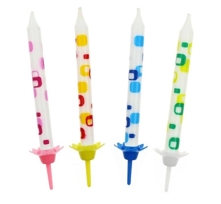 Białe świeczki z kolorowymi nadrukami oraz 12 plastikowych podstawek.