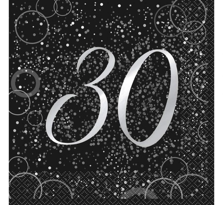 SERWETKI PAPIEROWE "GLITZ 30" Wymiary: 33 x 33 cm Ilość sztuk w opakowaniu: 16 Kolor: czarny Nadruk: srebrna liczba "30" i szare kropeczki.
