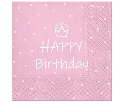 SERWETKI PAPIEROWE NA URODZINY Wymiary serwetek: 33 x 33 cm Kolor: J. Różowy Nadruk: Happy Birthday Materiał: papier Ilość sztuk w opakowaniu: 20