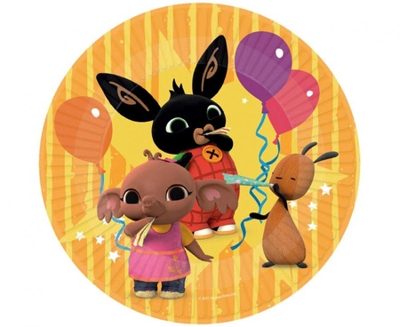 PAPIEROWE TALERZYKI BING PARTY Średnica: 23 cm Materiał: papier Kształt: okrągły Kolor: wielokolorowy Nadruk: bohaterowie bajki Bing W opakowaniu: 8 szt. Producent: Amscan