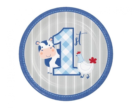 #ZTA Talerzyki papierowe Farmhouse Pierwsze urodziny, niebieskie, 18 cm, 8 szt.