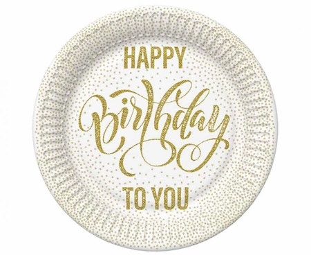 TALERZYKI PAPIEROWE HAPPY BIRTHDAY DOTTED GOLD Średnica: 23 cm Materiał: papier Kształt: okrągły W opakowaniu: 8 szt. Producent: Polmak