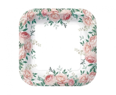 PAPIEROWE TALERZYKI Z NADRUKIEM RÓŻ Średnica: 23 cm Materiał: 100% papier Kształt: kwadratowy Kolor: biały, różowy, zielony Nadruk: kwiaty W opakowaniu: 10 szt. Producent: Paw