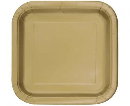 TALERZYKI PAPIEROWE ZŁOTE Wymiary: 23 x 23 cm Materiał: 100 % papier Kształt: kwadratowy Kolor: złoty W opakowaniu: 14 szt. Producent: Unique Party