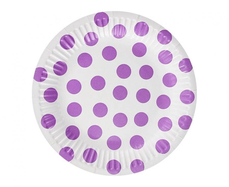 TALERZYKI PAPIEROWE W GROSZKI Średnica: 18 cm Materiał: Papier Kształt: Okrągły Kolor: Lawendowy Nadruk: Groszki W opakowaniu: 6 szt. Producent: GoDan S.A.