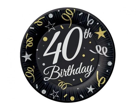 TALERZYKI PAPIEROWE B&C 40 Średnica: 18 cm Kolor: czarny Materiał: papier Kształt: okrągły Nadruk: 40th Birthday Ilość sztuk w opakowaniu: 6 szt. Kolekcja/linia: Beauty&Charm Producent: Godan S.A.