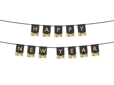 Baner Happy New Year, wykonany z czarnego papieru ze złotą folią oraz złotym napisem, wymiary ok. 135 x 16,5 cm, długość wstążki ok. 3,5 m.