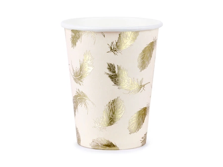 Kubeczki papierowe w kolorze jasnoróżowym ze złotymi metalizowanymi brzegami, pojemność ok. 220 ml. Kubki na napoje zawierają oznaczenia wymagane przez Rozporządzenie wykonawcze Komisji (UE) 2020/2151 z dnia 17 grudnia 2020 r. ustanawiające zasady dotyczące zharmonizowanych specyfikacji w odniesieniu do oznakowania produktów jednorazowego użytku z tworzyw sztucznych wymienionych w części D załącznika do dyrektywy Parlamentu Europejskiego i Rady (UE) 2019/904 w sprawie zmniejszenia wpływu niektórych produktów z tworzyw sztucznych na środowisko. Produkt zawiera etykietę wyłącznie w języku polskim, niemieckim, czeskim, francuskim, niderlandzkim, słowackim, słoweńskim i bułgarskim. (1 op. / 6 szt.)