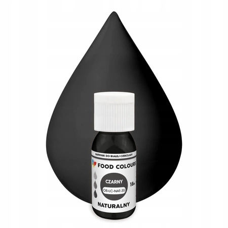 - Naturalny barwnik w płynie do mas tłustych i czekolady CZARNY 18ml to intensywny pigment na bazie węgla roślinnego. Idealny do barwienia czekolady, pralin i kremów. Płynna formuła zapewnia łatwe dozowanie i równomierne mieszanie z tłustymi masami.