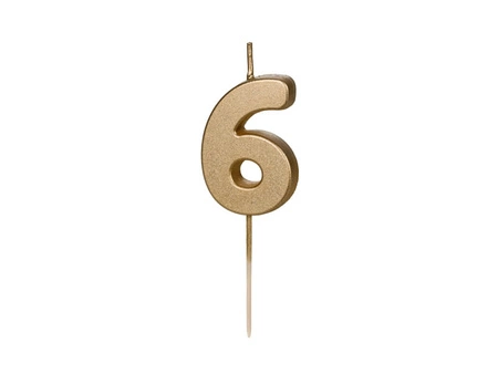 Świeczka urodzinowa Cyferka 6 w kolorze złotym, rozmiar ok. 4.5 cm.