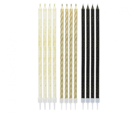 Świeczki metaliczno-brokatowe, czarne/białe/złote, 15.5x0.5 cm, 12 szt.