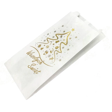 Ekologiczne torebki papierowe fałdowe z nadrukiem „Wesołych Świąt” to praktyczne i eleganckie opakowanie sezonowe do wyrobów piekarniczych i cukierniczych, a także drobnych upominków. Wykonane z białego papieru siarczanowego (kraft) o gramaturze 35 g/m² – lekkie, a zarazem wytrzymałe i dopuszczone do kontaktu z żywnością. Sprawdzą się w piekarniach, cukierniach, kawiarniach, na kiermaszach świątecznych oraz w sklepach detalicznych.