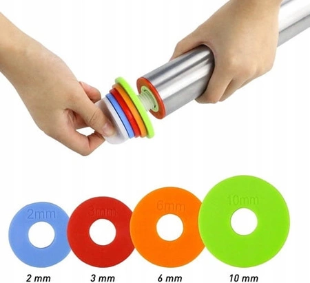 Wałek posiada trzy zestawy pierścieni, które pozwalają na regulację grubości ciasta na 2 mm, 3 mm, 6 mm lub 10 mm. Wystarczy nałożyć odpowiednie pierścienie na końce wałka, a następnie rozwałkować ciasto. Pierścienie działają jako ograniczniki, dzięki czemu ciasto jest równomiernie rozwałkowane na całej powierzchni.