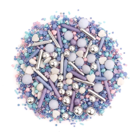 FROZEN to bajkowa, zimowa posypka, która nada Twoim wypiekom i słodkościom śnieżnego blasku. Delikatne perełki, gwiazdki i confetti w odcieniach błękitu i bieli przywodzą na myśl mroźne, baśniowe krajobrazy, a srebrne pałeczki i czekoladowe kule w różnych rozmiarach dodają całości efektownego połysku.
