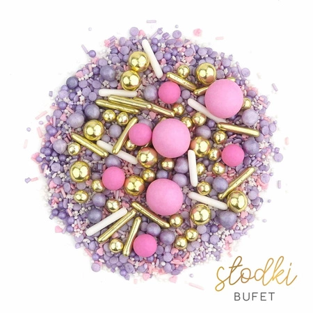 Posypka RAPUNZEL to propozycja dla miłośników fioletowego koloru i bajek Disneya. Piękny fioletowy perłowy kolor w połączeniu z pastelowym różem sprawiają, że ta posypka cukrowa wygląda zachwycająco. Ozdobne elementy w klasycznym złocie oraz różowe pastelowe czekoladowe kule dodają elegancji i smaku. Ta posypka będzie idealna do dekoracji tortów i ciast na urodziny małych księżniczek i inne dziecięce przyjęcia.