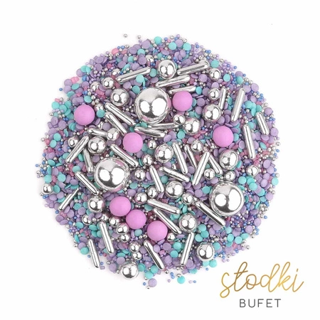 SHINY FLAKES to niespodziewany best seller w naszej kolekcji. Nieoczywiste połączenie kontrastujących ze sobą elementów i kolorów sprawia, że ta posypka szybko wpada w oko i zwraca na siebie uwagę. Posypka składa się głownie z confetti oraz bardzo drobnych perełek w intensywnym zestawieniu fioletu i turkusu. Całość zwieńczona jest zarówno błyszczącymi jak i matowymi elementami ozdobnymi.