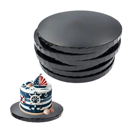 Czarny kolor podkładu to symbol nowoczesności i elegancji. Doskonale komponuje się z różnymi stylami dekoracji tortów, podkreślając ich wyjątkowy charakter. Jest to idealny wybór na wszelkiego rodzaju uroczystości, gdzie liczy się nie tylko smak, ale również prezentacja. Okrągły kształt oraz czarne wykończenie boków dodają mu dodatkowego uroku, a jego minimalistyczny design z pewnością przypadnie do gustu osobom ceniącym prostotę i elegancję.