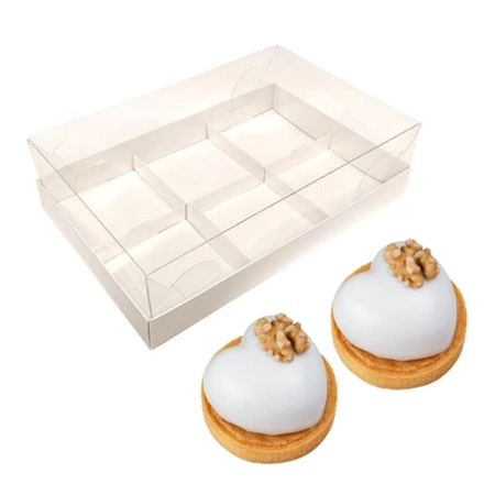 Perłowe białe pudełko na 6 monoporcji – przezroczyste wieko i eleganckie wykończenie dla efektownej ekspozycji słodkości