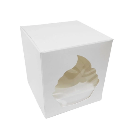 Eleganckie pudełko na muffinkę wykonane z wysokiej jakości tektury w kolorze białym.