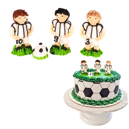 Zestaw zawiera 3 figurki piłkarzy w klasycznych białych strojach z czarnymi paskami oraz cukrową piłkę. Taka dekoracja świetnie sprawdzi się na: