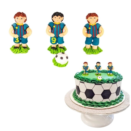 Zestaw zawiera 3 piłkarzy w dynamicznych pozach, ubranych w niebieskie stroje z fioletowymi paskami, oraz cukrową piłkę. To idealna dekoracja na: