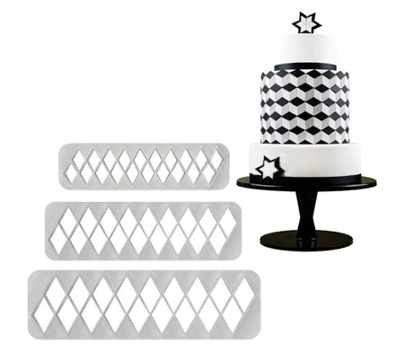 Zestaw 3 sztuk foremek do wycinania geometrycznych wzorów w kształcie rombów. Idealne narzędzie do tworzenia dekoracji zwłaszcza z masy cukrowej.